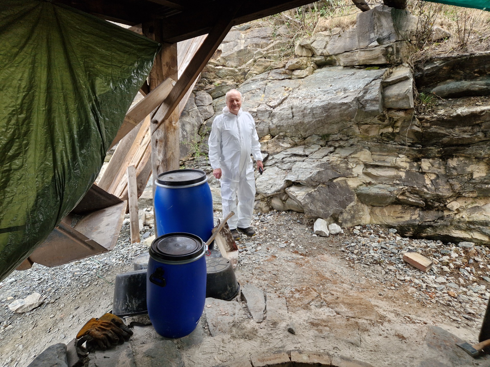 Etter kort tid var alt som var ubrent marmorstein fjernet fra ovnen (ubrent, men leskbar marmorstein). Nå var resterende marmorstein godt gjennombrent nedover i omnen, uavhengig av størrelse på steinen. Jobbet fram til lørdags kveld. Fekk tømt store deler av omnen før me gav oss. Fikk litt hjelp av svigerbror Geir den siste timen. Fortsette tømmingen søndagen. Det var litt vanskelig å få fylt opp tønnene like raskt siden det var mye ubrente kjerner som måtte sorteres bort i nedre delen rundt hvelvet. Ente opp med mange godt fylte 60 liters tønner med brent mosterkalk og nokre få hundre liter ubrent stein som er godt brukande til lesking. Dette kan gi ca hundre liter med kulekalk.